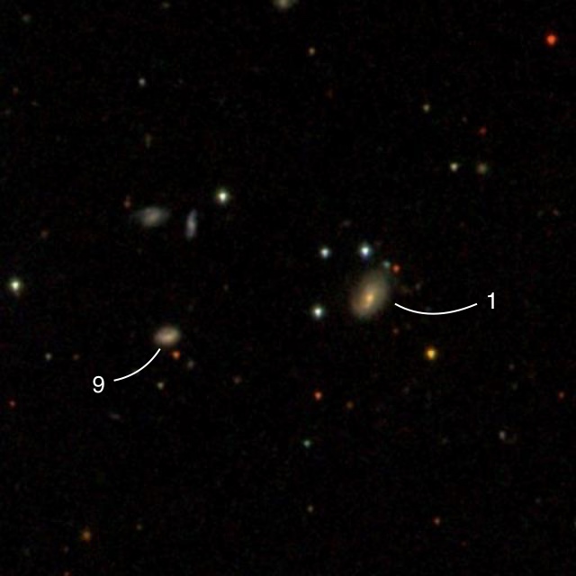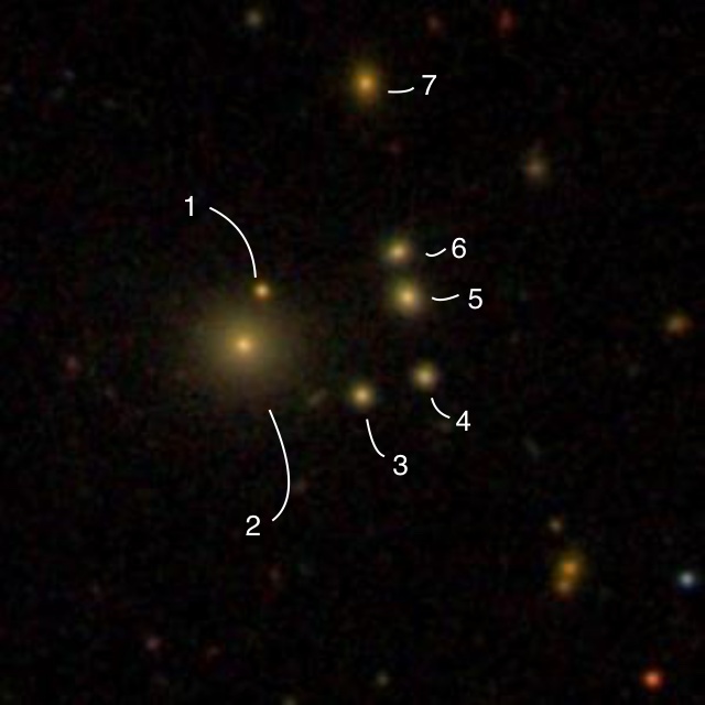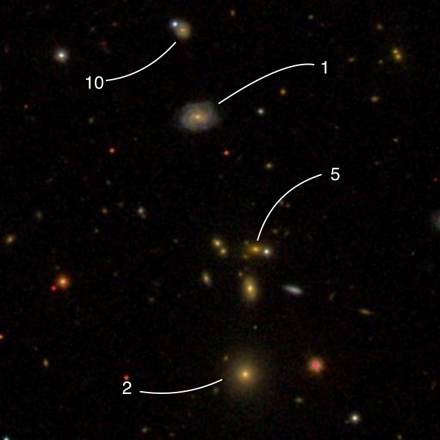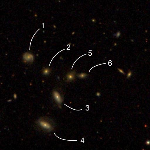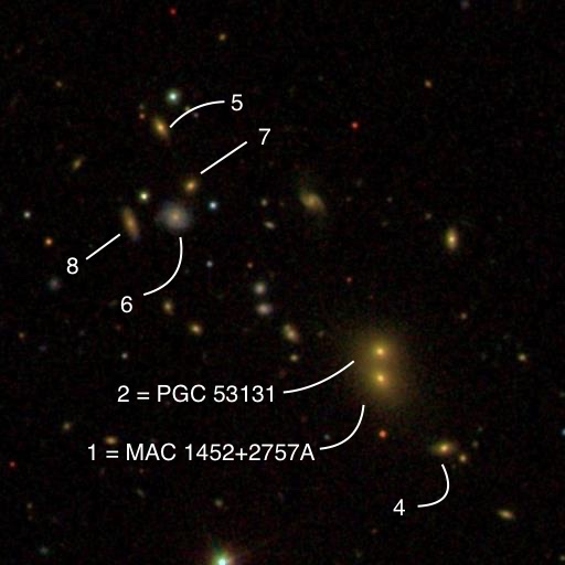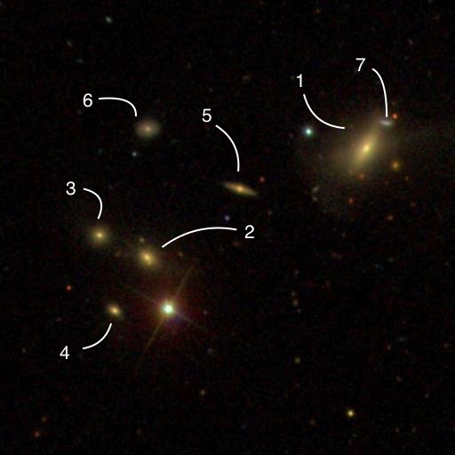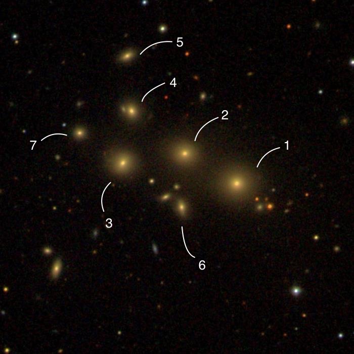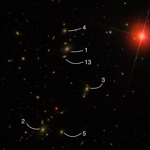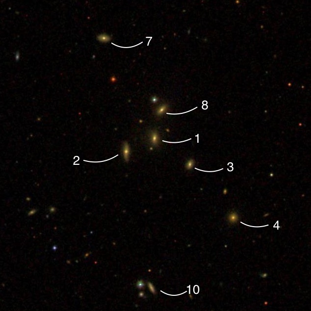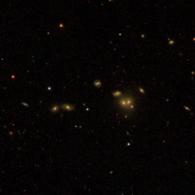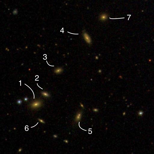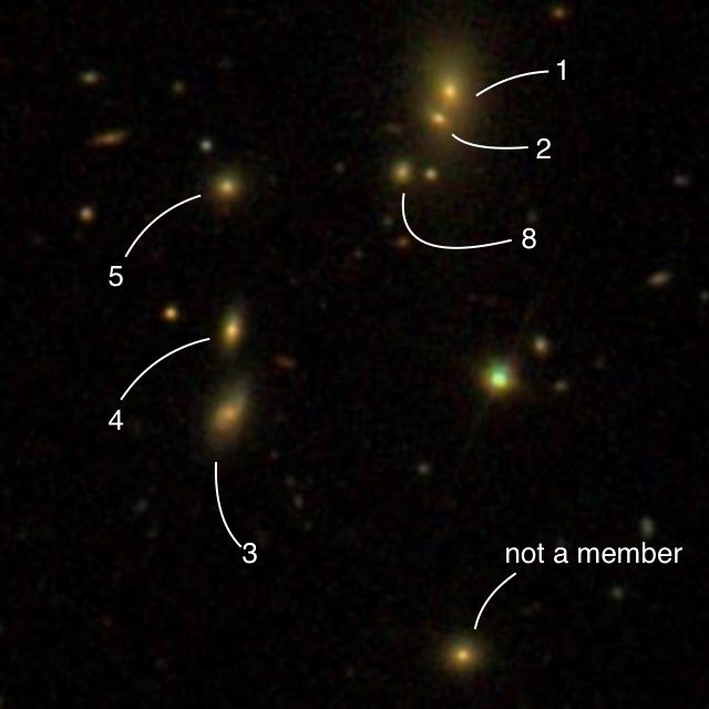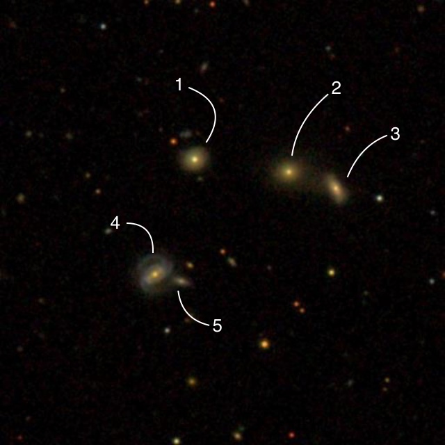 It turned out that one of the richest groups was the first one, Shakhbazian 1. The spectra of the five objects in Shakhbazian 1 calculated the distance to be about 2 billion light years distant with a diameter of 620,000 light years across and the average diameter of individual galaxies was just 40,000 light years across. In comparison, the Milky Way and Andromeda Galaxy were about 100,000 and 130,000 light years across respectively, and 2.2 million light years from each other. It was also found that the absolute magnitude of the brightest member of Shakhbazian 1 is -23.0, which means that it is one of the brightest known galaxies. The velocity dispersion is very low, suggesting that they are together in one compact group. Imagine what that would look like for the deep sky observer from one of hte member galaxies! 5+ high luminosity galaxies crammed into a "small" 620,000 light year space.