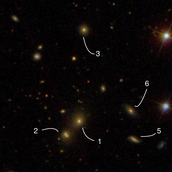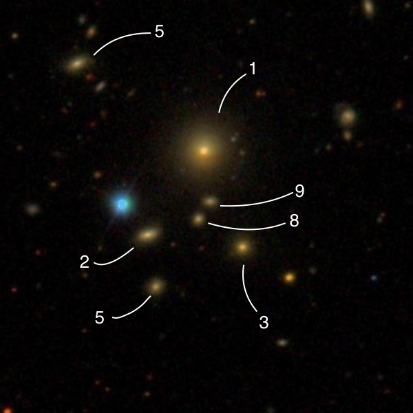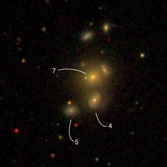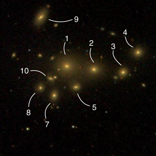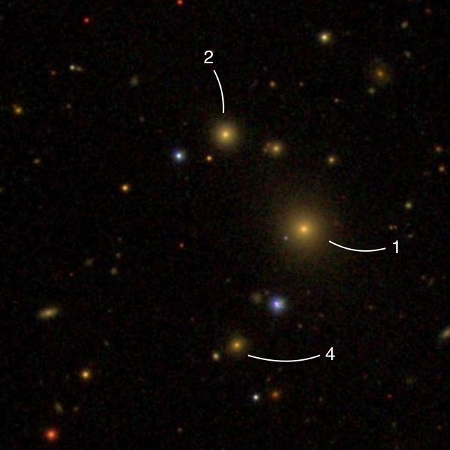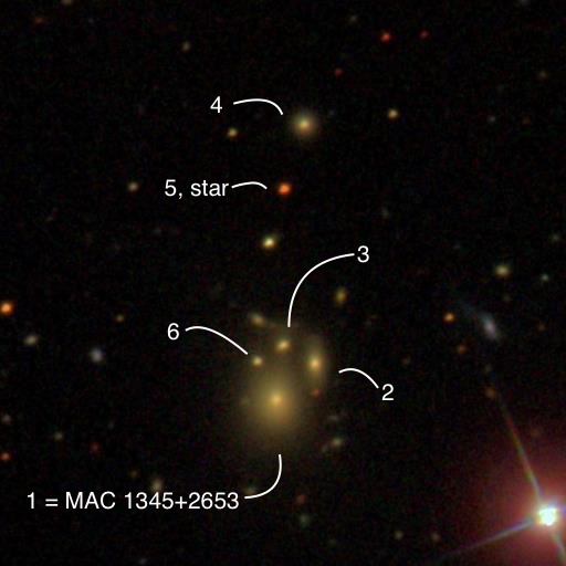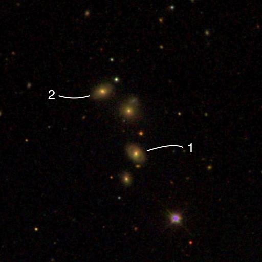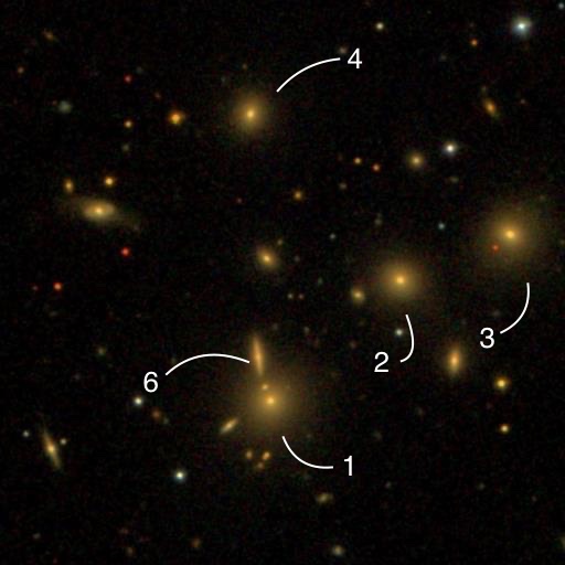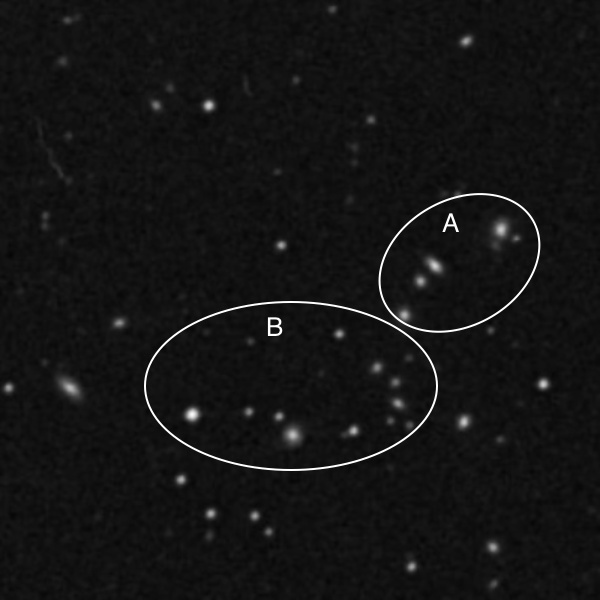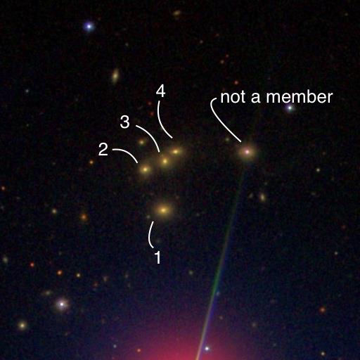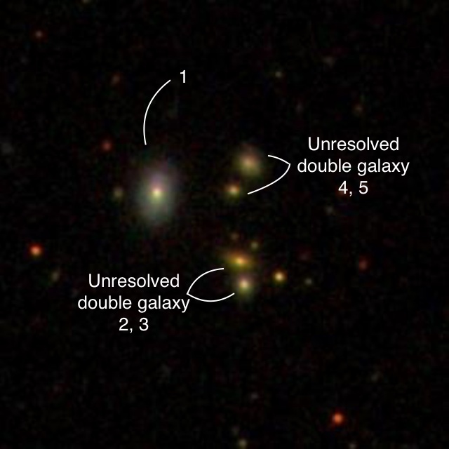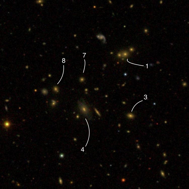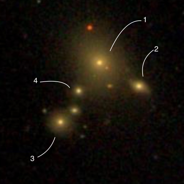 It turned out that one of the richest groups was the first one, Shakhbazian 1. The spectra of the five objects in Shakhbazian 1 calculated the distance to be about 2 billion light years distant with a diameter of 620,000 light years across and the average diameter of individual galaxies was just 40,000 light years across. In comparison, the Milky Way and Andromeda Galaxy were about 100,000 and 130,000 light years across respectively, and 2.2 million light years from each other. It was also found that the absolute magnitude of the brightest member of Shakhbazian 1 is -23.0, which means that it is one of the brightest known galaxies. The velocity dispersion is very low, suggesting that they are together in one compact group. Imagine what that would look like for the deep sky observer from one of hte member galaxies! 5+ high luminosity galaxies crammed into a "small" 620,000 light year space.