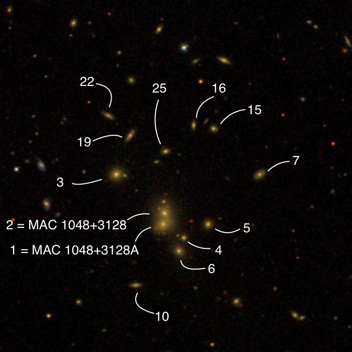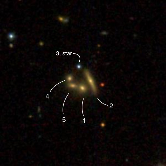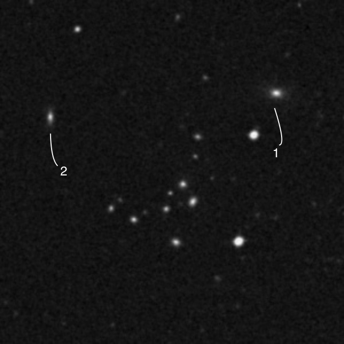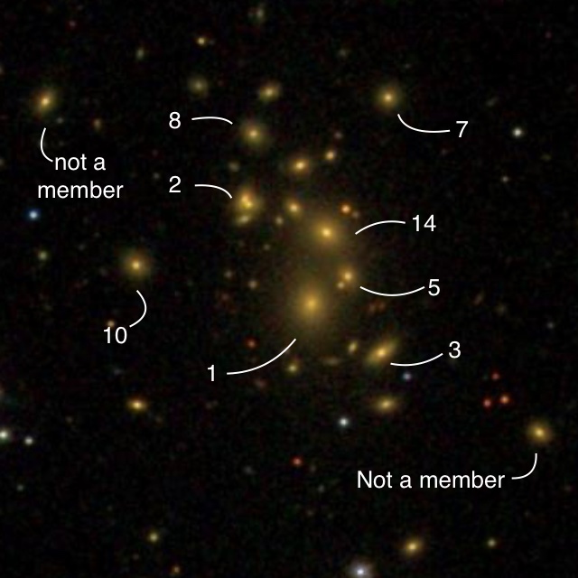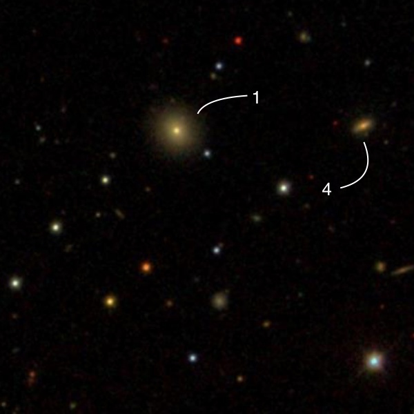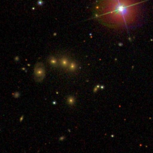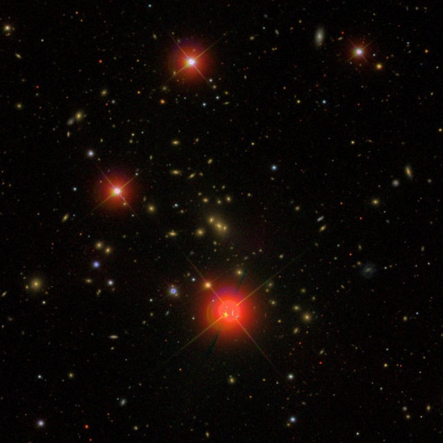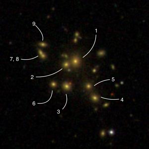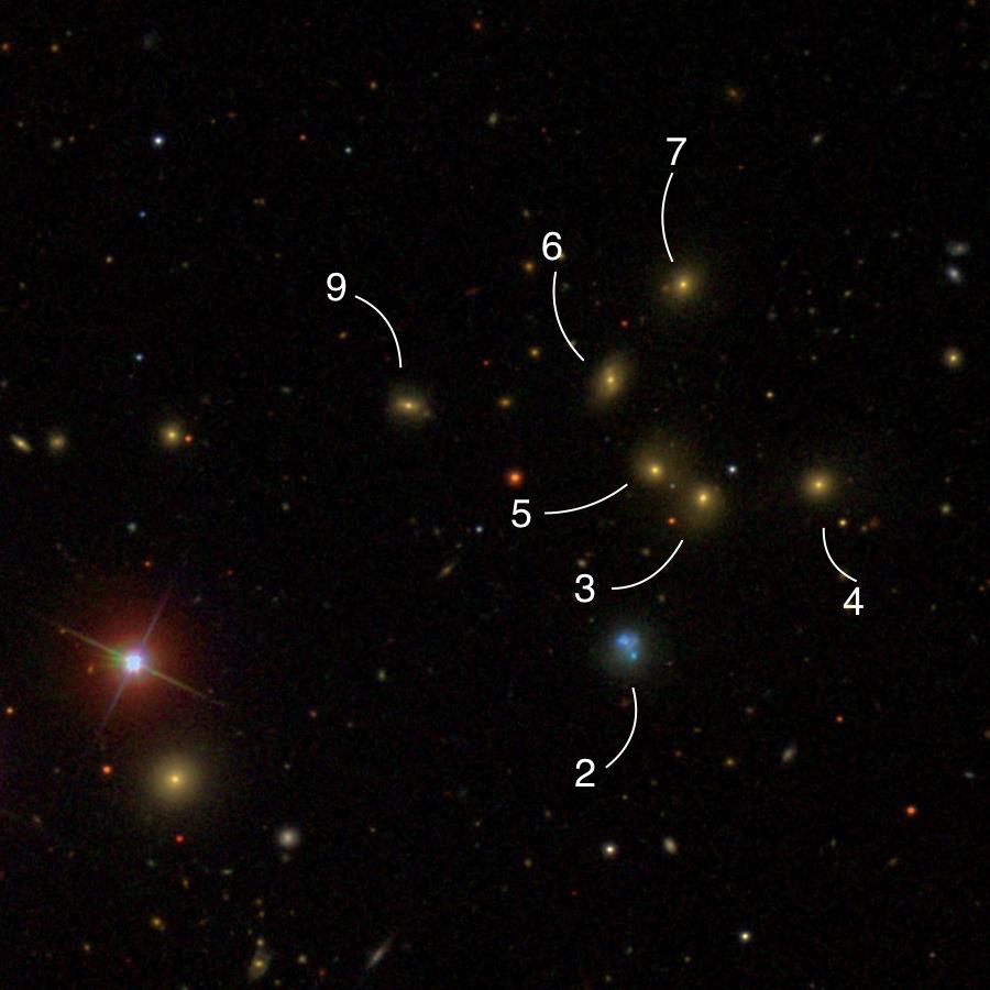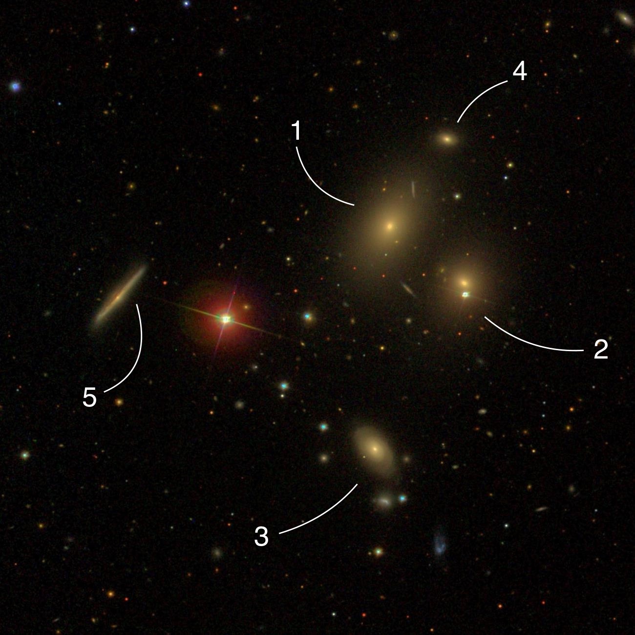 It turned out that one of the richest groups was the first one, Shakhbazian 1. The spectra of the five objects in Shakhbazian 1 calculated the distance to be about 2 billion light years distant with a diameter of 620,000 light years across and the average diameter of individual galaxies was just 40,000 light years across. In comparison, the Milky Way and Andromeda Galaxy were about 100,000 and 130,000 light years across respectively, and 2.2 million light years from each other. It was also found that the absolute magnitude of the brightest member of Shakhbazian 1 is -23.0, which means that it is one of the brightest known galaxies. The velocity dispersion is very low, suggesting that they are together in one compact group. Imagine what that would look like for the deep sky observer from one of hte member galaxies! 5+ high luminosity galaxies crammed into a "small" 620,000 light year space.