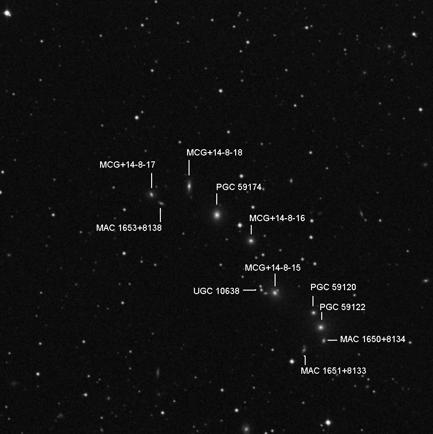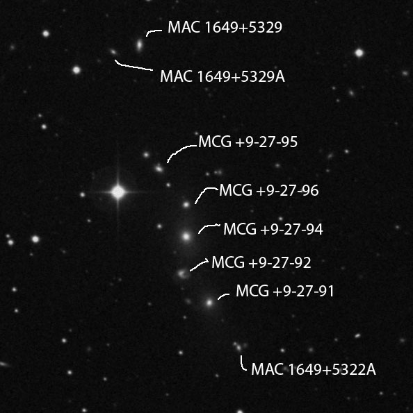 Shakhbazian 16 22” @ 203, 293, 377 and 528x Five galaxies are chained in a rough N-S line and almost equally spaced. From top to bottom are MCG+9-27-95, -96, -94, -92 and -91. They are roughly 45” to 60” apart. A 8.7 magnitude star lies just 1.2’ ESE of the top member. MCG+9-27-95 – Very faint, extremely small round patch. About 10” across and even surface brightness. A 16th magnitude star lies about 20” NE MCG+9-27-96 – Very faint, extremely small round patch. About 10” across and even surface brightness. MCG+9-27-94 – Considerably faint, very small round patch of about 20” diameter. It has a gradually brightening center. MCG+9-27-92 – Considerably faint, very small round patch. About 15” diameter and even surface brightness throughout. MCG+9-27-91 – Considerably faint, very small round patch, with a very slightly brighter center. About 20” across. MAC 1649+5322A – not seen |