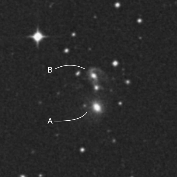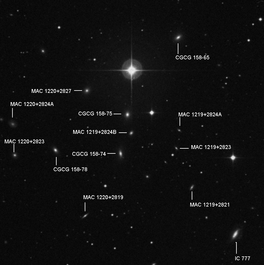 ![]() Shakhbazian 213 48” @ 488x – Total of five galaxies seen and one labelled star are seen. Component 1, MAC 1345+2653, is by far the brightest of the bunch and is slightly elongated even surface brightness glow. Component 6 is a nearly stellar glow just off the NNE edge. Components 2 and 3 are slightly further, but very close to the edge of MAC 1345+2653 and are very small round glows. Component 4 is a faint, very small round glow. A 10.0 mag star lies 1.7’ WSW of MAC 1345+2653. Best to keep that star off the field using a narrow field eyepiece, such as an orthoscopic or a supermonocentric. |