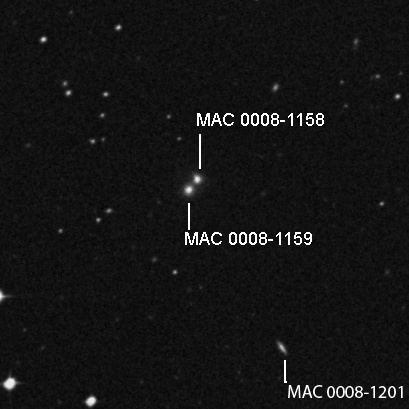 ![]() Shakhbazian 262 22” @ 328 and 383x – Very faint double galaxy, MAC 0008-1158 and MAC 0008-1159, positioned 0.2’ apart and PA = 135. Both are round and very small. Even surface brightness. |