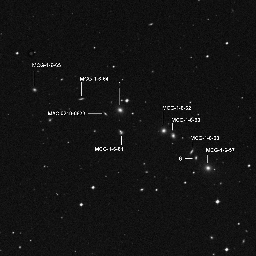 ![]() Shakhbazian 317 22” @ 287 and 460x - Nice string of galaxies. 6 were immediately seen at 287x. Upon further observation, two more galaxies were detected at the east end, MCG 1-6-64 and -65. At 460x, one more galaxy, which is unlabeled “B” was detected. The six seen, from west to east, were MCG-1-6-57, 58, 59, 60, 61 and an unlabeled “6”. The unlabeled galaxy “1”, which is the brightest of the chain, is closest to the 13.6 mag star. |