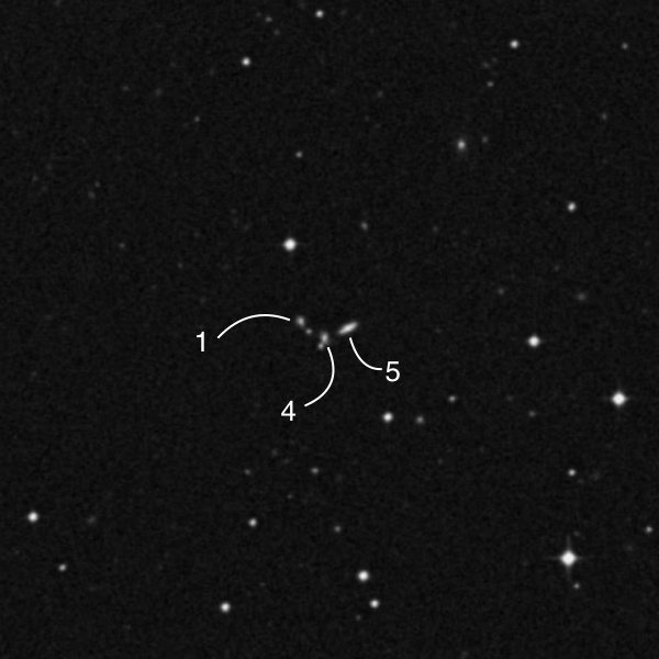 Shakhbazian 22 48” @ 488x and 610x – Total of five galaxies seen. Component 4 is a fairly faint small round glow with component 5 just off the west edge. The other three components; 1, 2 and 3, are faint small round glows. |