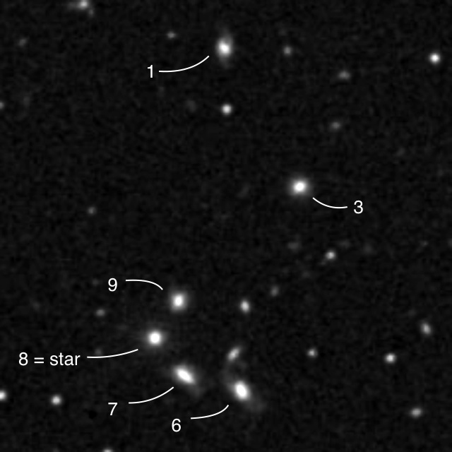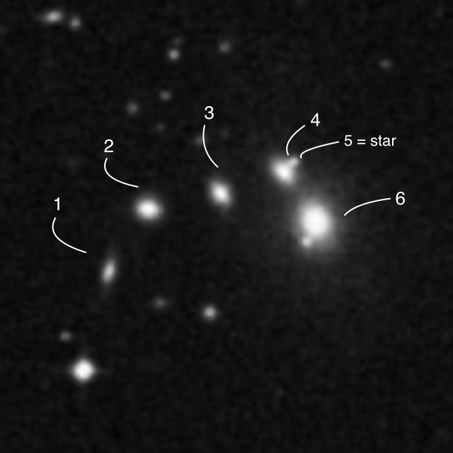 Shakhbazian 11 48” @ 488 and 610x – Seven galaxies detected as faint to very faint small round glows. A faint star is just 10” east of component 2. A very faint star is just 10” NE of component 8. |