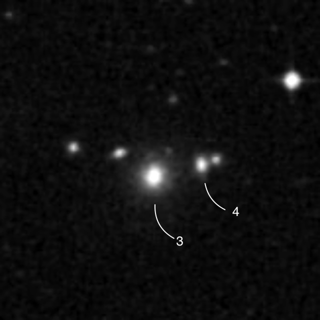 3522” @ 383, 460 and 591x – total of four members seen. The brightest one, 1, is the “right angle” of a 30-60-right triangle. Faint round even surface brightness glow. Component 2 at the “60-degree” angle and component 3 at the “30-degree angle” appear as very faint round even surface brightness glows. Component 4, is an extremely faint very small round glow is between 1 and 3. |
