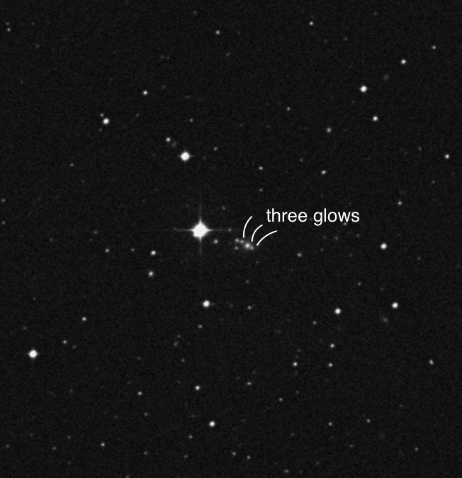 Shakhbazian 19 22” @ 306 and 460x - This was observed at the Texas Star Party under NELM 7.2 skies. The unresolved group appeared as an extremely faint slightly elongated glow. PA = 90° and less than 10” across. The star to the north was not detected. 30” @ 542x – The glow is a 2:1 elongated unresolved glow. PA = 90. The star was detected and brighter than the unresolved glow. 48” @ 813x – Galaxies 1, 4 and 5 - Appeared as three distinct nuclei immediately detected. Galaxy 2 – a thin glow with a nearly stellar core with PA = 150. |