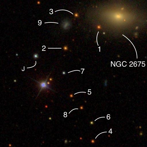 ![]() Shakhbazian 98 48” @ 488, 610 and 813x – A curved chain of seven faint galaxies (marked as 2 to 9), which seven are nearly stellar. I didn’t detect the galaxy labeled as “9”. “1” is just off the SE edge of NGC 2675. “J”, a non-member, is the brightest of the very small stellar galaxies and lies about 45” east of the upper middle part of the chain. A 13.0 mag star lies 30” east from the center of the chain. Nearby galaxy, NGC 2675 is a very bright slightly elongated glow with diffuse edges and a much brighter small core. Note: Most of the “objects” are faint stars, but the chain is still cool to observe. |
