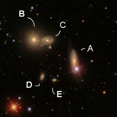 22 f/4 (383, 460, 575 and 690x) All seven members seen the first time with first observations of components E to G. I personally think that the listed mags may be a bit on the low side as I doubt that I can go as deep as mag 18.4 with a 22 reflector. Ill discuss all but A and B Component C (PGC 70943, mag 16.2b, 0.7x0.3) Considerably faint 5:2 elongated glow with defined edges. Slight brighter center. PA = 0 and 0.5 long. Component D (PGC 70936, mag 16.4b, 0.3x0.2) Faint, very small round glow with a stellar core. 0.1 across Component E (PGC 70937, mag 17.7, 0.4x0.1) Extremely faint, very small round glow that pops in and out several times. Averted vision about 33% of the time. Component F (PGC 70939, mag 18.2, 0.2) Very faint, very small round glow. Held with averted vision about 75% of the time. This is actually brighter than component E. Component G (PGC 70941, mag 18.4, 0.2x0.1) Extremely faint, extremely small round glow that popped in and out only four times. Averted vision about 25% of the time. |